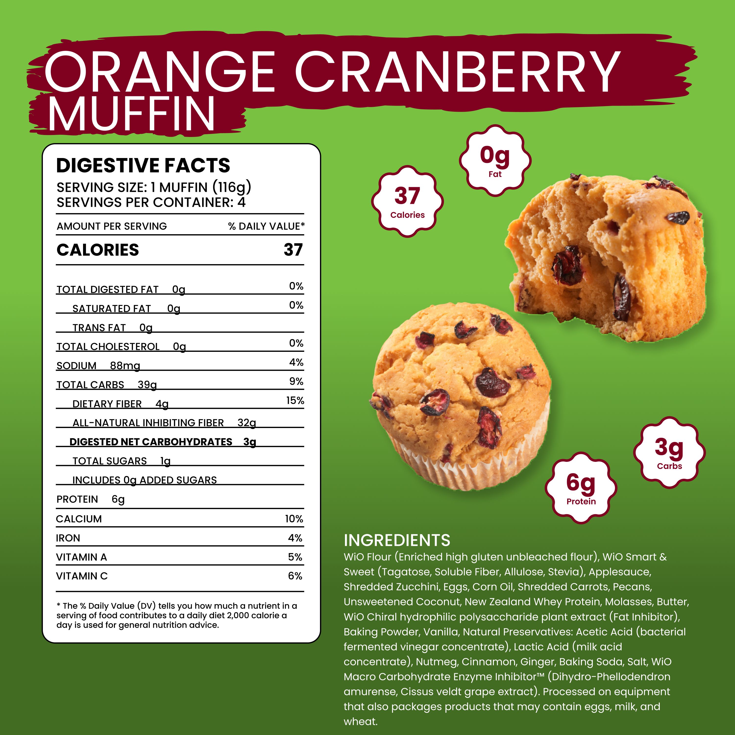 Ingredients: Wheat WiO Flour, Butter, Smart & Sweet, Sour cream, Cranberries, Orange extract, Orange zest, Vanilla extract, Natural preservative, WiO Fat Inhibitor (modified Alpha-Cyclodextrin-plant extract), WiO Macro Carbohydrate Enzyme Inhibitor (Cissus veldt grape extract), Baking powder, Baking soda, Sea salt. Processed on equipment that also packages product(s) that may contain nuts, eggs, wheat flour, and dairy.