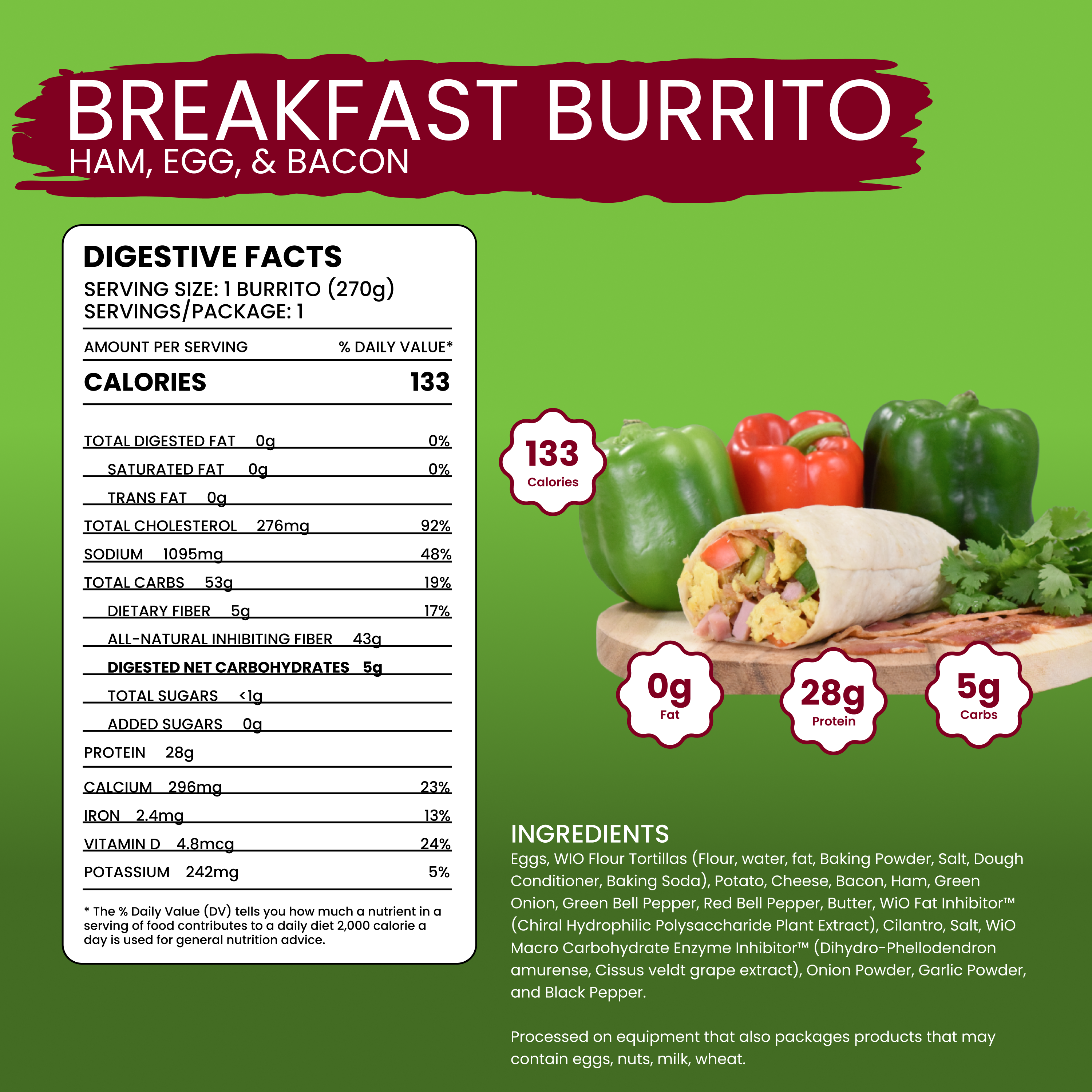 Eggs, WIO Tortilla (Flour, water, fat, Baking Powder, Salt, Dough Conditioner, Baking Soda), Potato, Cheese, Bacon, Ham, Green Onion, Green Bell Pepper, Red Bell Pepper, Butter, WiO Fat Inhibitor (Chiral Hydrophilic Polysaccharide Plant Extract), Cilantro, Salt, WiO Marco Carbohydrate Enzyme Inhibitor (Cissus Velt Grape Extract), Onion Powder, Garlic Powder, and Black Pepper.