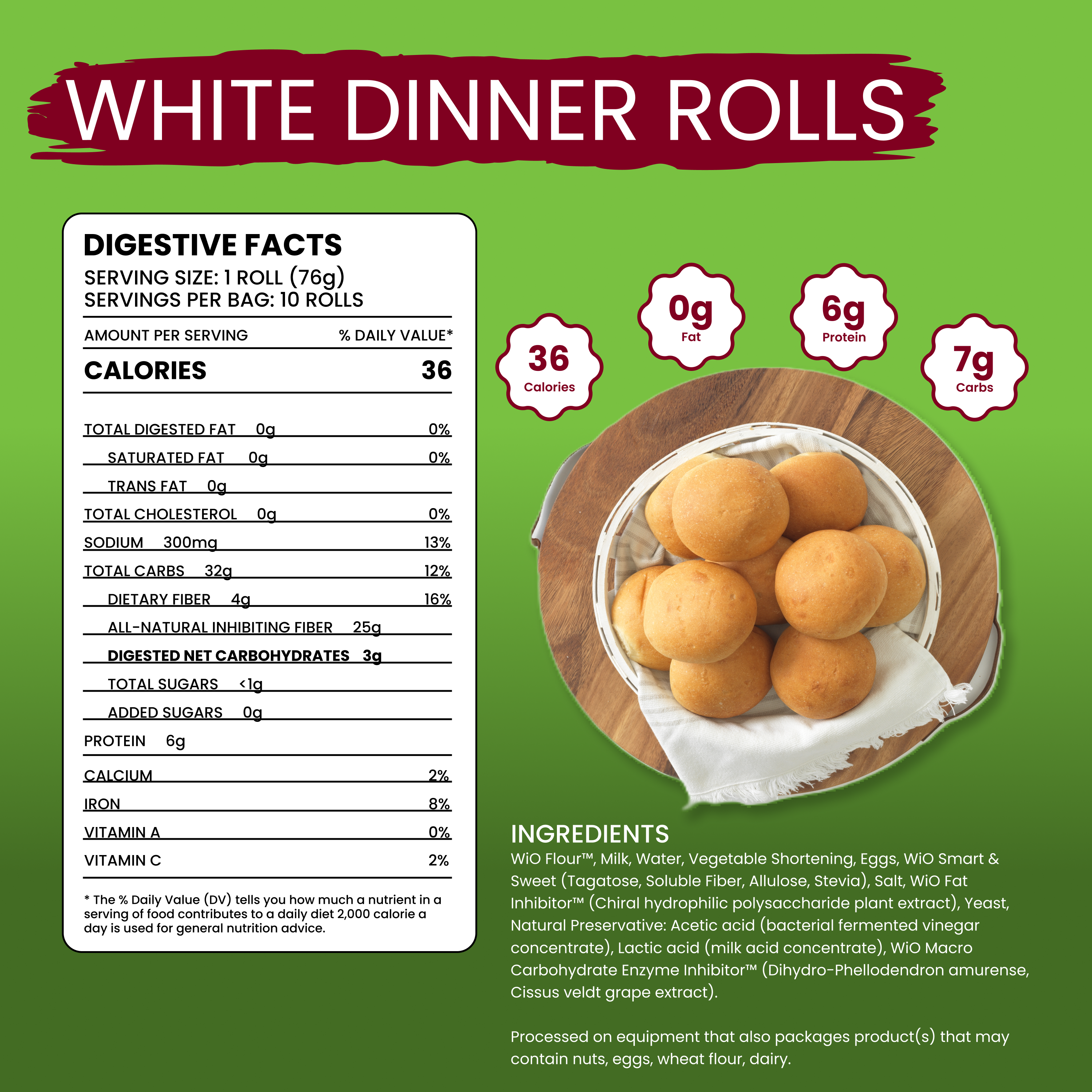 Ingredients: WiO Flour, Milk, Water, Vegetable Shortening, Eggs, WiO Smart & Sweet (Tagatose, Soluble Fiber, Allulose, Stevia), Salt, WiO Fat Inhibitor (Chiral hydrophilic polysaccharide plant extract), Yeast, Natural Preservative: Acetic acid (bacterial fermented vinegar concentrate), Lactic acid (milk acid concentrate), WiO Macro Carbohydrate Enzyme Inhibitor (Cissus veldt grape extract). Processed on equipment that also packages products that may contain eggs, nuts, milk, and wheat.