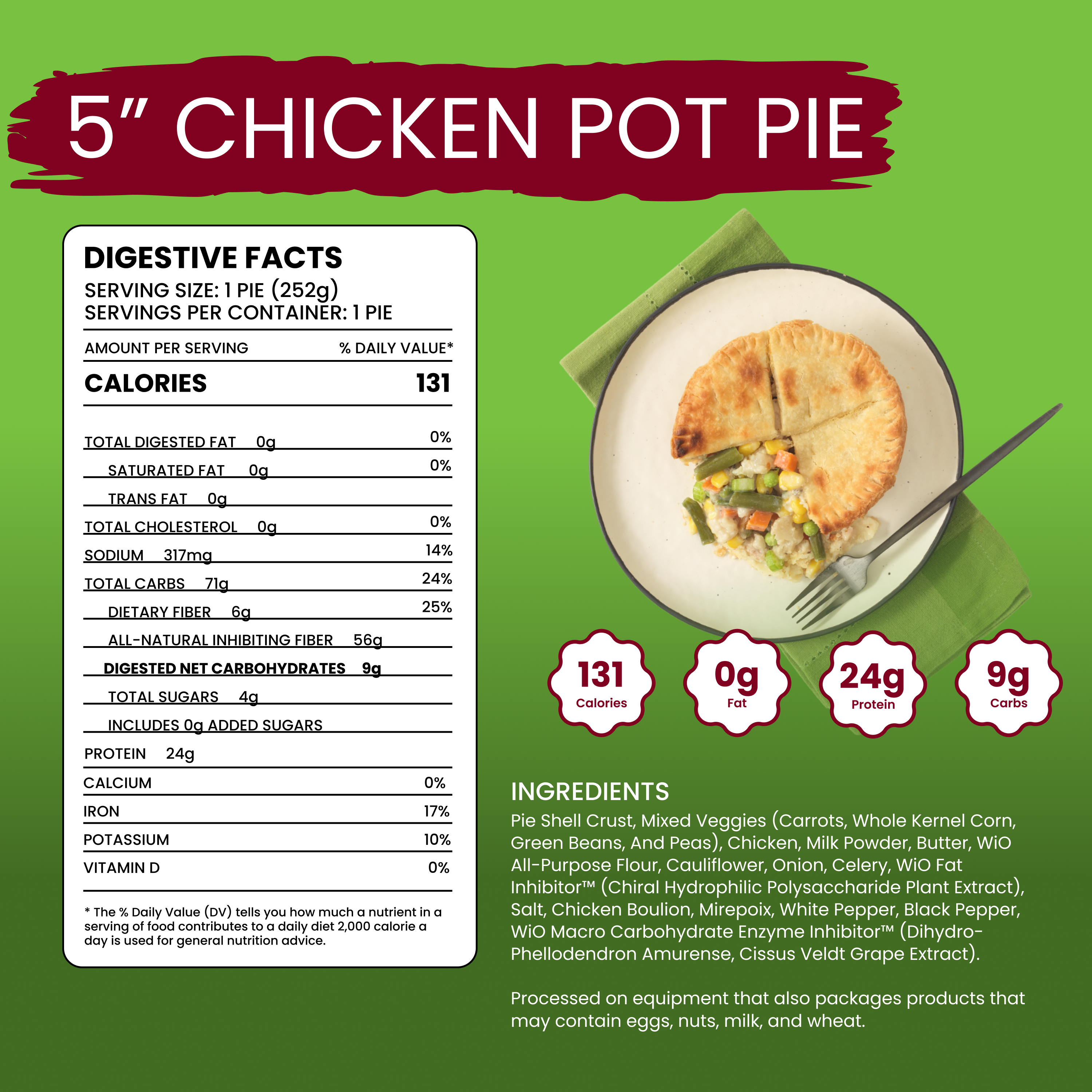 Pie Shell Crust, Mixed Veggies (carrots, whole kernel corn, green beans, and peas), Chicken, Milk Powder, Butter, WiO All-Purpose Flour, Cauliflower, Onion, Celery, WiO Fat Inhibitor (Chiral Hydrophilic Polysaccharide Plant Extract), Salt, Chicken Boulion, Mirepoix, White Pepper, Black Pepper, WiO Macro Carbohydrate Enzyme Inhibitor (Dihydro-Phellodendron amurense, Cissus veldt grape extract).