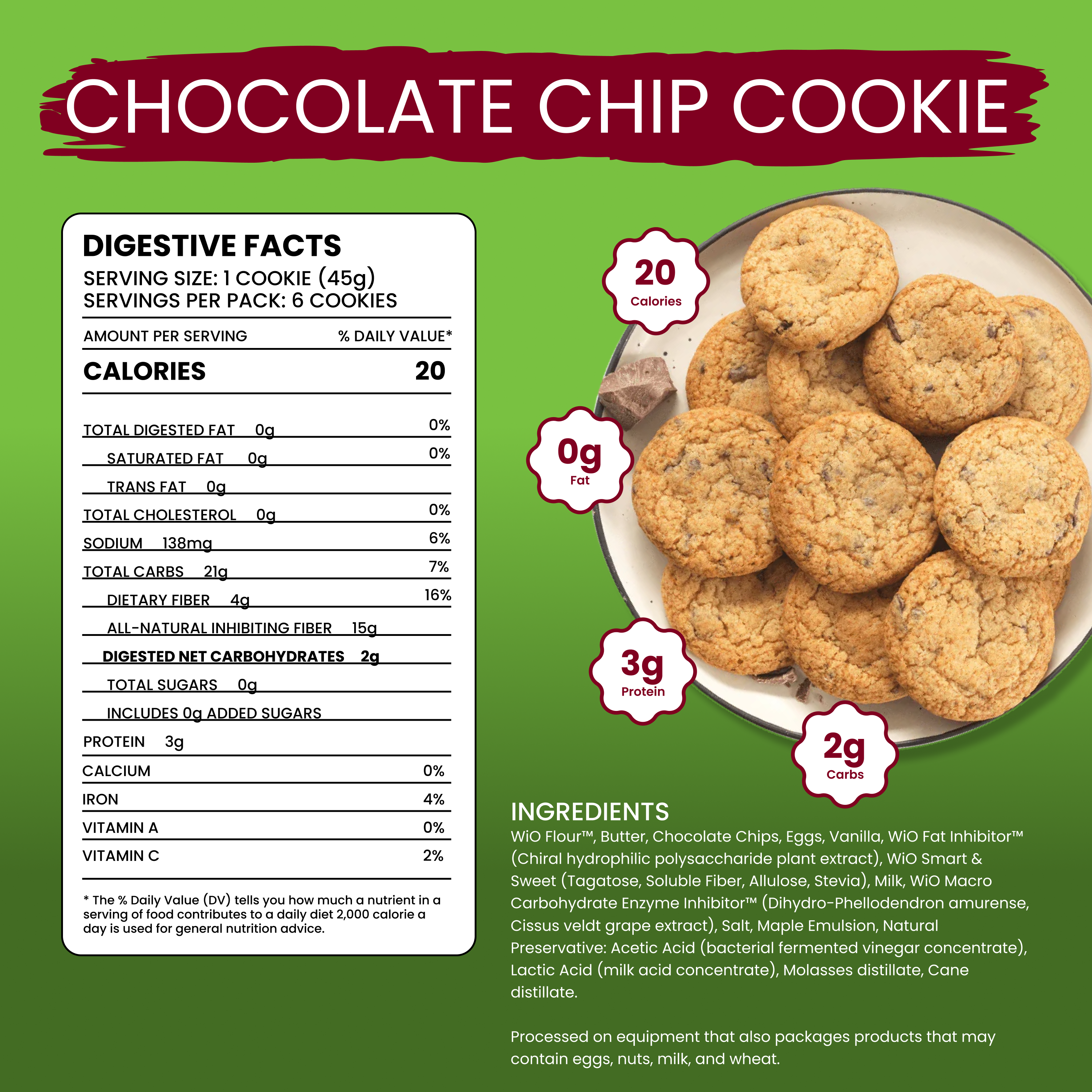 Ingredients: WiO Flour, Butter, Chocolate Chips, Eggs, Vanilla, WiO Fat Inhibitor (Chiral hydrophilic polysaccharide plant extract), WiO Smart & Sweet (Tagatose, Soluble Fiber, Allulose, Stevia), Milk, WiO Macro Carbohydrate Enzyme Inhibitor (Cissus veldt grape extract), Salt, Maple Emulsion, Natural Preservative: Acetic Acid (bacterial fermented vinegar concentrate), Lactic Acid (milk acid concentrate), Molasses distillate, Cane distillate. Processed on equipment that also packages products that may contain eggs, nuts, milk, and wheat.