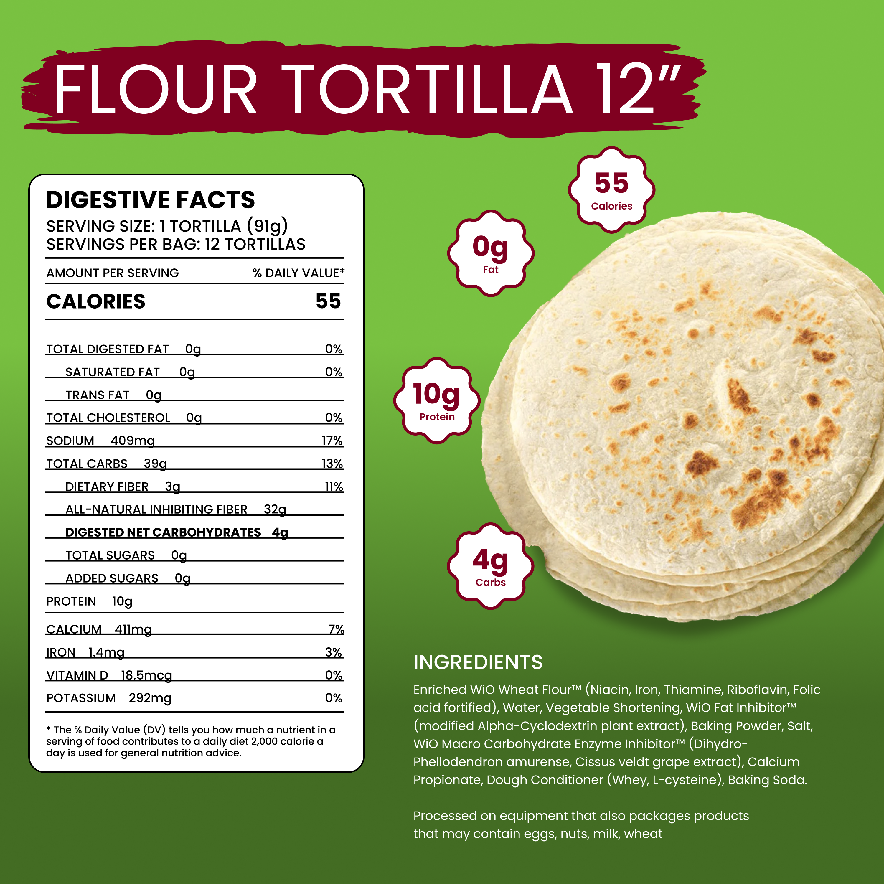 NUTRITION FACTS Without WiO Carb & Fat Inhibitor: Serving size 1 tortilla, Servings per Package 10, Amount per Serving: Calories 267, Fat Cal. 53, Total Fat 6g (10% DV), Saturated Fat 2g (9% DV), Trans Fat 0g (0% DV), Cholesterol 0mg (0% DV), Sodium 409mg (19% DV), Total Carbs. 44g (16% DV), Dietary Fiber 2g (10% DV), Sugars 5g, Protein 10g. Percent Daily Values are based on a 2,000 calorie diet.