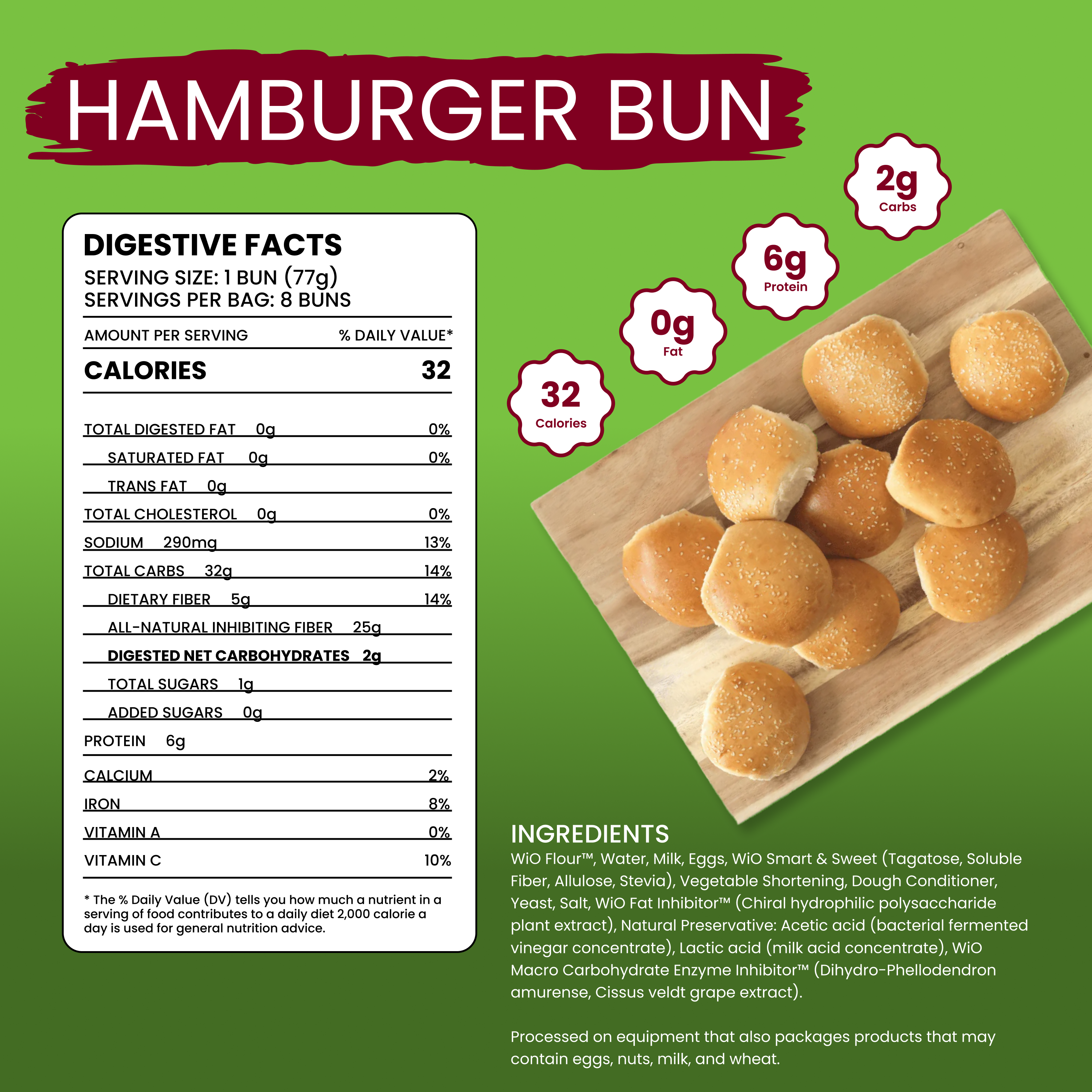 Nutrition Facts Before Carb & Fat Inhibitors: Serving size 1 Bun. Servings per Bag: 8. Amount per Serving: Calories 190, Fat Cal. 32, Total Fat 3.5g (4% DV), Saturated Fat 1g (5% DV), Trans Fat 0g (0% DV), Cholesterol 20mg (7% DV), Sodium 290mg (13% DV), Total Carbs. 32g (12% DV), Dietary Fiber 4g (14% DV), Sugars 1g, Protein 6g. Percent Daily Values are based on a 2,000 calorie diet.