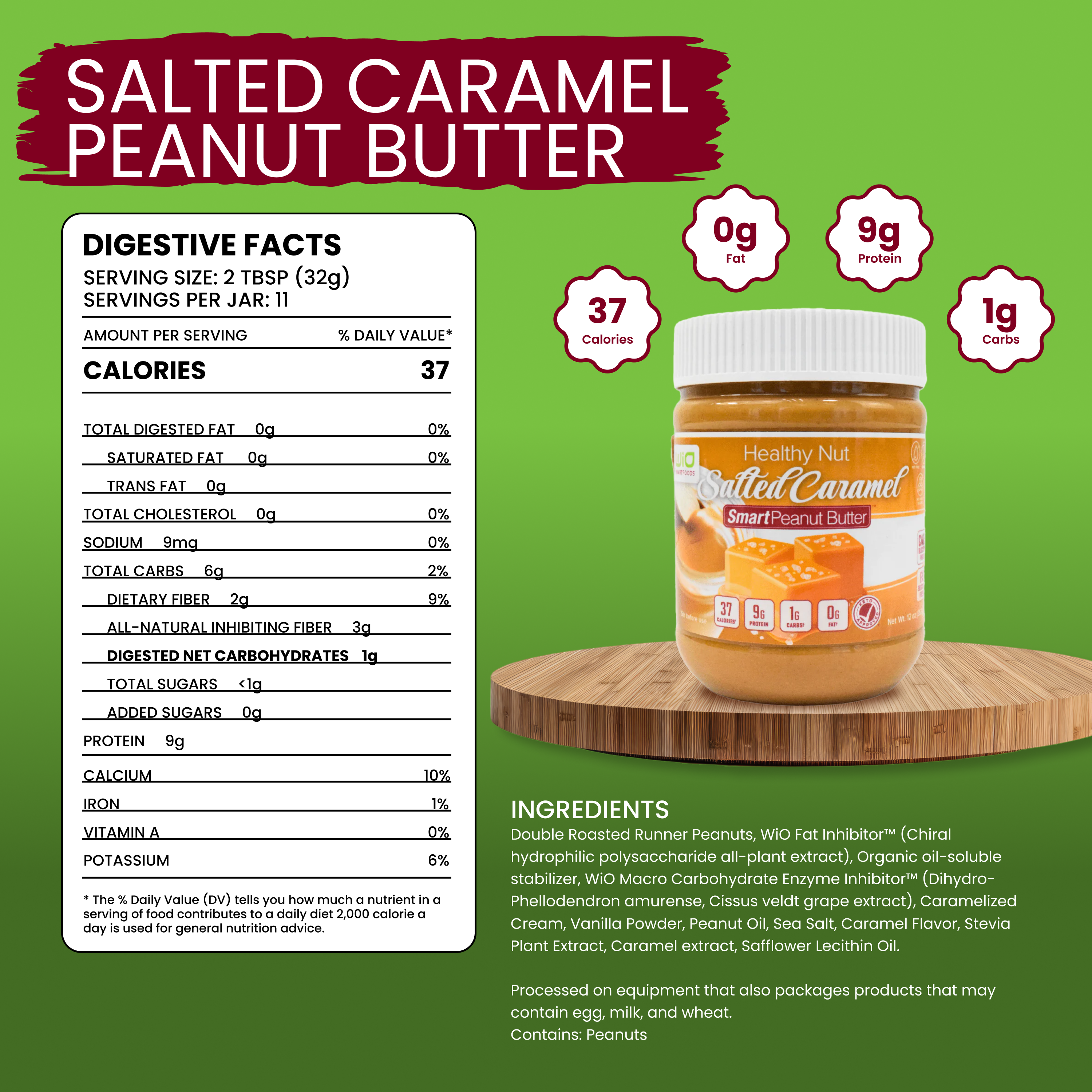 WiO Fat Inhibitor (Chiral hydrophilic polysaccharide all-plant extract), Organic oil-soluble stabilizer, WiO Macro Carbohydrate Enzyme Inhibitor (Cissus veldt grape extract), Caramelized Cream, Vanilla Powder, Peanut Oil, Sea Salt, Caramel Flavor, Stevia Plant Extract,
