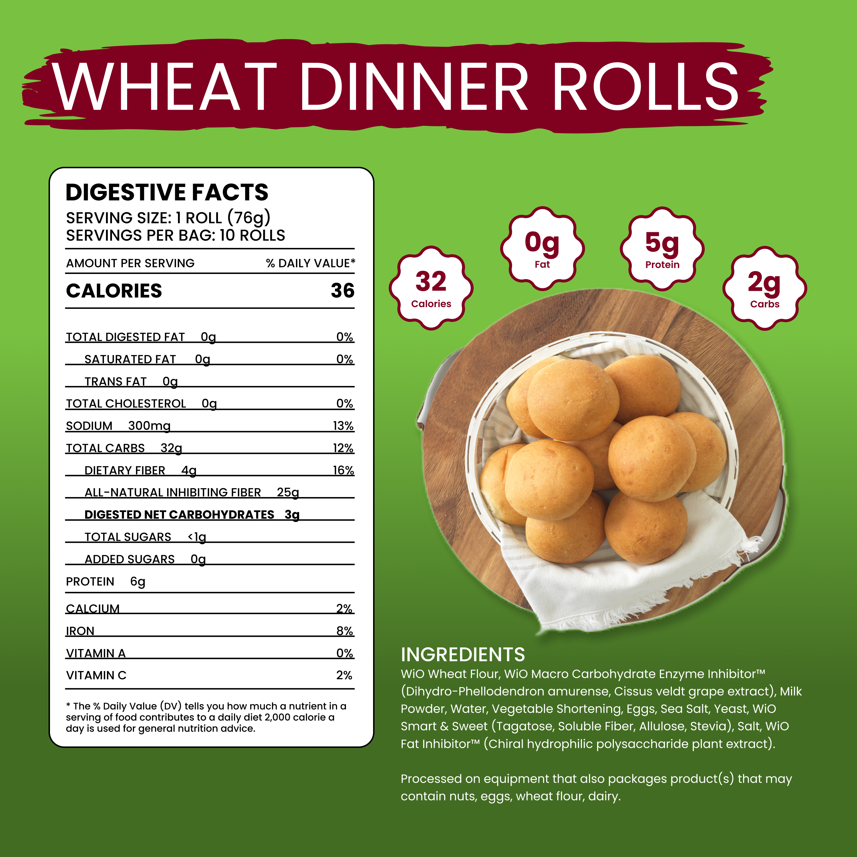 Ingredients: Wheat WiO Flour (wheat flour, patented cissus veldt grape extract), Milk powder, Water, Vegetable shortening, Eggs, Sea Salt, Yeast, WiO Smart & Sweet™ (Tagatose, Soluble Fiber, Erythritol, Stevia), WiO Fat Inhibitor™ (patented chiral hydrophilic polysaccharide plant extract). Processed on equipment that also packages products that may contain eggs, nuts, milk, and wheat.